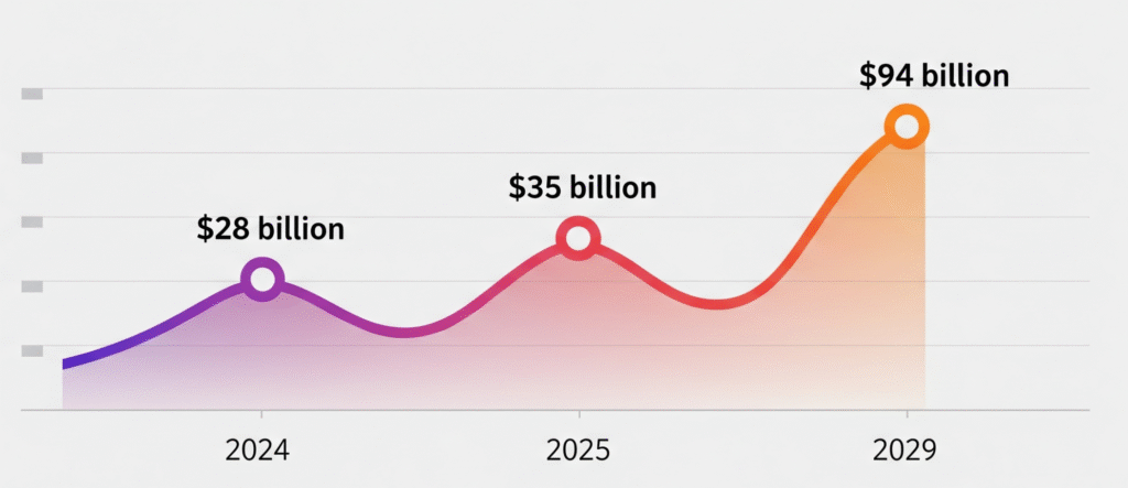 Le marché du no-code est passé de 28,1 milliards $ en 2024 à 35,86 milliards $ en 2025, avec un CAGR de 27,6 %. Il atteindrait 93,92 milliards $ d’ici 2029.